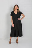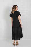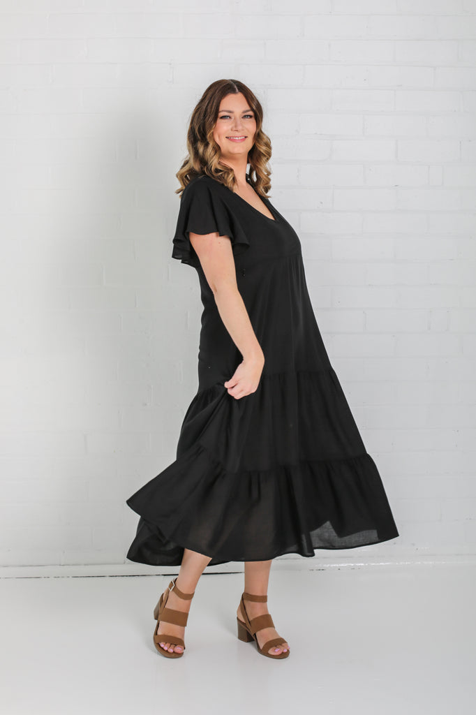 - Black midi length dress with tiered skirt